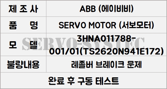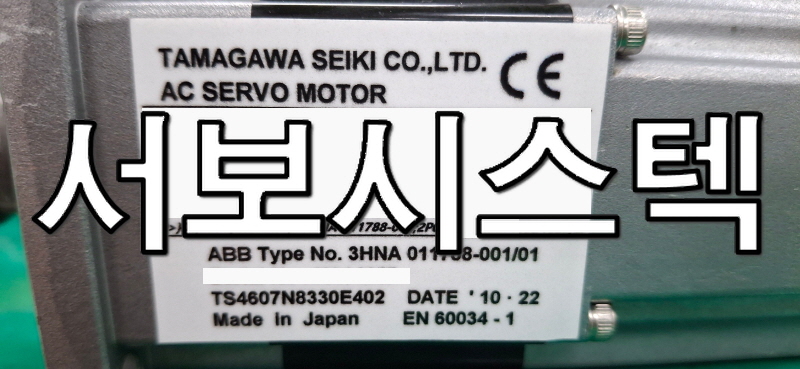 이번 수리한 제품은 ABB TAMAGAWA AC SERVO MOTOR이며, 모델은 3HNA011788-001/01(TS2620N941E172)입니다.