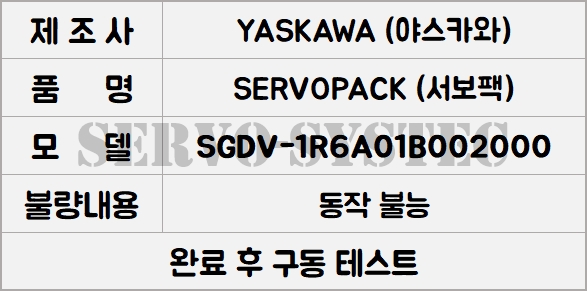 이번에 수리된 드라이버는 YASKAWA SERVOPACK (모델: SGDV-2R8A01B)입니다.