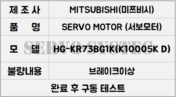 안녕하십니까. 오늘 소개해 드릴 수리 사례는 MITSUBISHI AC SERVO MOTOR (TAKAMURA REDUCER) 일체형 모델인 **HG-KR73BG1K(K10005K D)**입니다.